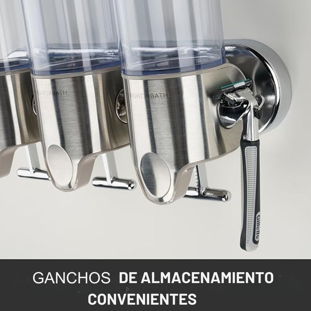 El dispensador tiene tres compartimentos: uno para champú, otro para acondicionador y uno más para gel de ducha.