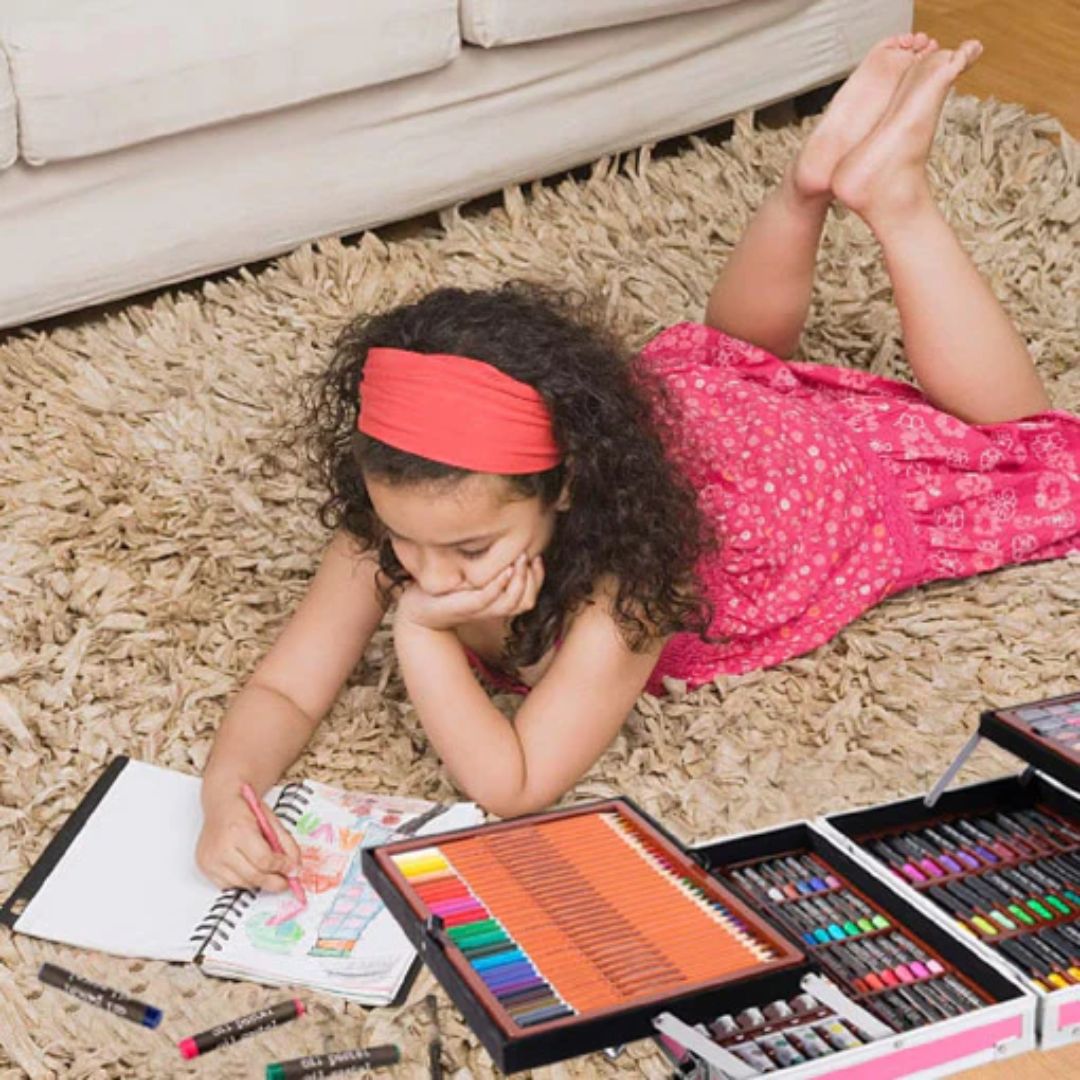 El kit incluye lápices de colores, acuarelas, pasteles al óleo, marcadores, pinceles, paletas de plástico, borradores, sacapuntas y más.